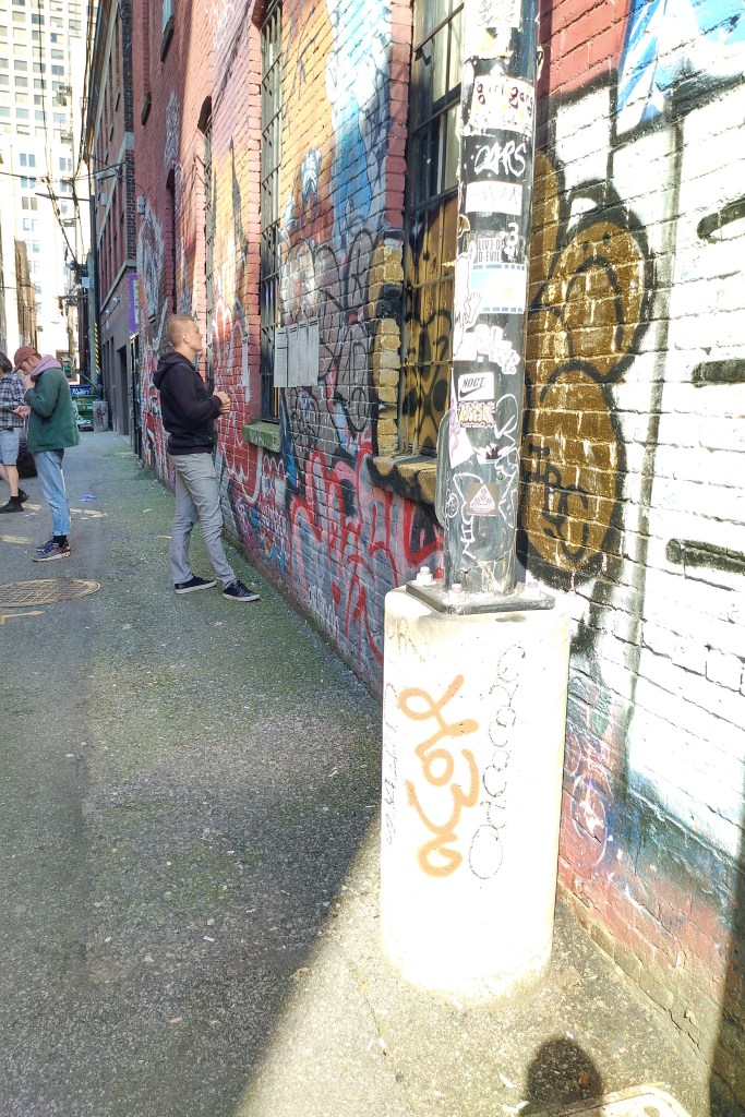 The first local shop I saw doing this was Revolver. A caffe that is regularly jammed to the rafters any time it is open. I thought I would wander by, just in case. To my delight they had hung a paper sign, pointing to the alley. In addition, some tape on the ground guided me to a smiling face through the bars.