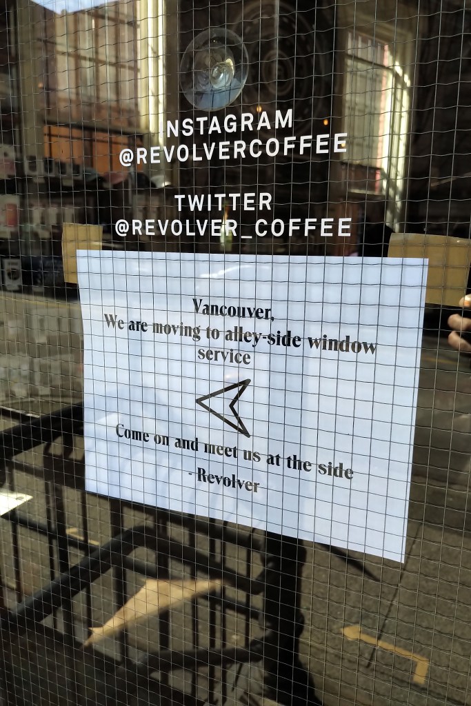 I believe this is the way forward in the medium term for all service based businesses in Vancouver. Find a way to innovate that will allow service to continue, the economy to at least run as much as is feasible while protecting our vulnerable community members. Others have created lists of shops and roasters doing deliveries and continuing to sell beans online, such as Vancouver Coffee Snob