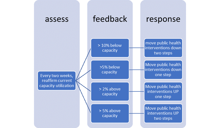 Set a target setpoint of, say, 50% ICU/Hospital utilization for Covid patients. The response to these measures then could be per the process below (numbers are quite arbitrarily set). Note the more amplified inverse response to being above capacity, compared to being below.